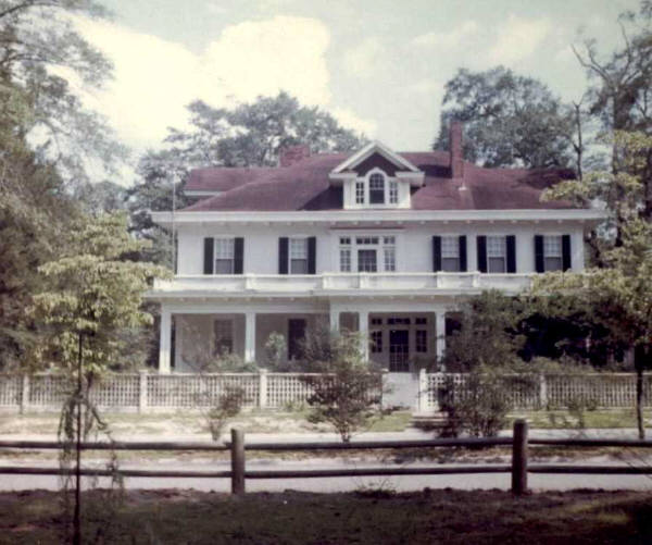 This home was the residence of E. A. Hauss, manager of the Alger-Sullivan Lumber Company for over 50 years. It rested on the area presently occupied by the 1913 Post Office Museum building in the James Houston Jones Historical Park. At Mr. Hauss' death, his will was that the home be dismantled so no one could live there. It was taken down board by board and reassembled almost to its original grandeur east of Jay, Florida. At the time, it was generally felt that Hauss' wishes were extremely selfish as well as foolish. The years have shown his wisdom, for such a home would prove very expensive to keep up. He feared it would fall into disrepair and become a shambles, which very likely would have happened. This photo is part of a collection of Dan Leach, son of Marion and Audra Leach, who lived immediately behind this house. That former Leach home is now the Leach House Museum, one of the three museums in the Historical Park, with the Boxcar Museum just to its north. The Park is located at the corner of Jefferson Avenue and Fourth Street (once called "Silk Stocking Street") in the Alger-Sullivan Historical District.