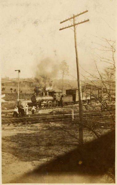 Often folks would travel to the woods for enjoyment or to visit relatives in South Alabama. Note the "conductor" standing beside the cab of the locomotive and the mill storage sheds in the background.