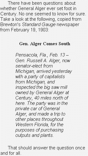 One thing we do know today is that General Alger was one of the motivating forces behind the establishment of the town now known as Century, Florida. Little did he know his foresight and work would have a profound effect on those of us living here today, as well as so many other thousands who are influenced to this day by a single investment in a sawmill.
